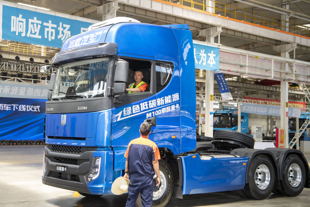 在位于山西省晋中市榆次区的山西新能源汽车工业有限公司(吉利晋中基地)总装车间内,工作人员驾驶甲醇重卡进行出厂前的调试(2022年6月21日摄)。新华社记者 杨晨光 摄