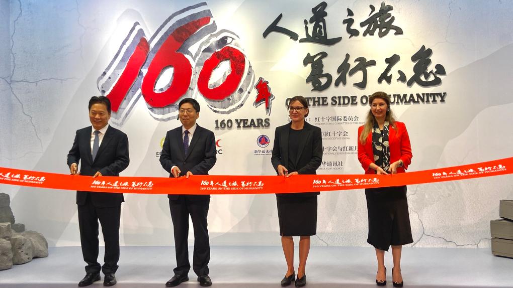 开幕式上,与会嘉宾为“160年人道之旅 笃行不怠”图片展开幕剪彩。红十字国际委员会主席斯波利亚里茨(左三)、中国红十字会党组书记、常务副会长王可(左二)、新华社副社长袁炳忠(左一)、红十字会与红新月会国际联合会东亚地区代表处主任奥嘉为图片展剪彩。新华社记者 董博婷 摄