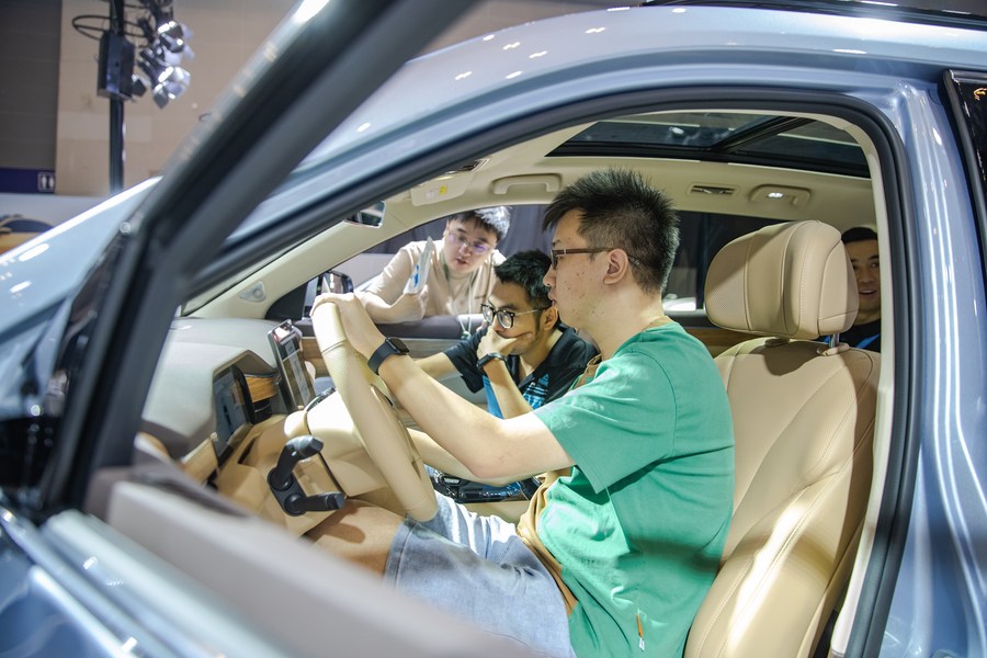 9月4日,观众在2023智博会赛力斯展厅内参观了解新能源汽车。新华社记者 黄伟 摄