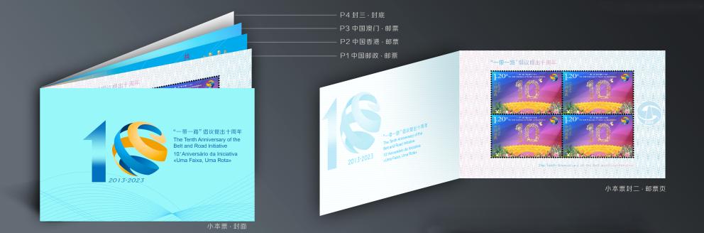 邮票图案名称为“一带一路”倡议提出十周年,图案以花卉、和平鸽,以及代表基础设施合作和互联互通概念的公铁运输车辆、货轮、起重机等元素共同组成的数字“10”为主体,并结合“丝路金桥”元素。邮票由北京邮票厂有限公司影写工艺印制,另与香港邮政、澳门邮电共同印制同题材小本票1本。