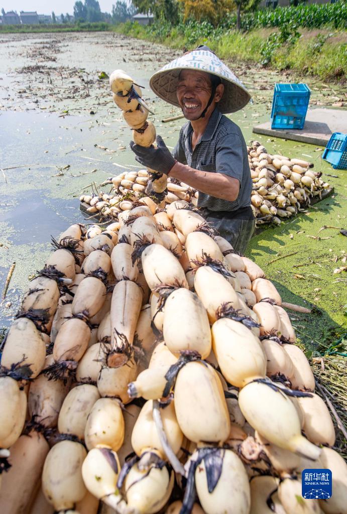 9月7日,农户在江苏省泰州市姜堰区顾高镇夏庄村莲藕种植基地分拣采收的莲藕。