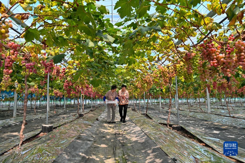 9月7日,在江苏省盐城市建湖县一处葡萄园,农业工人在运输刚采摘的葡萄。