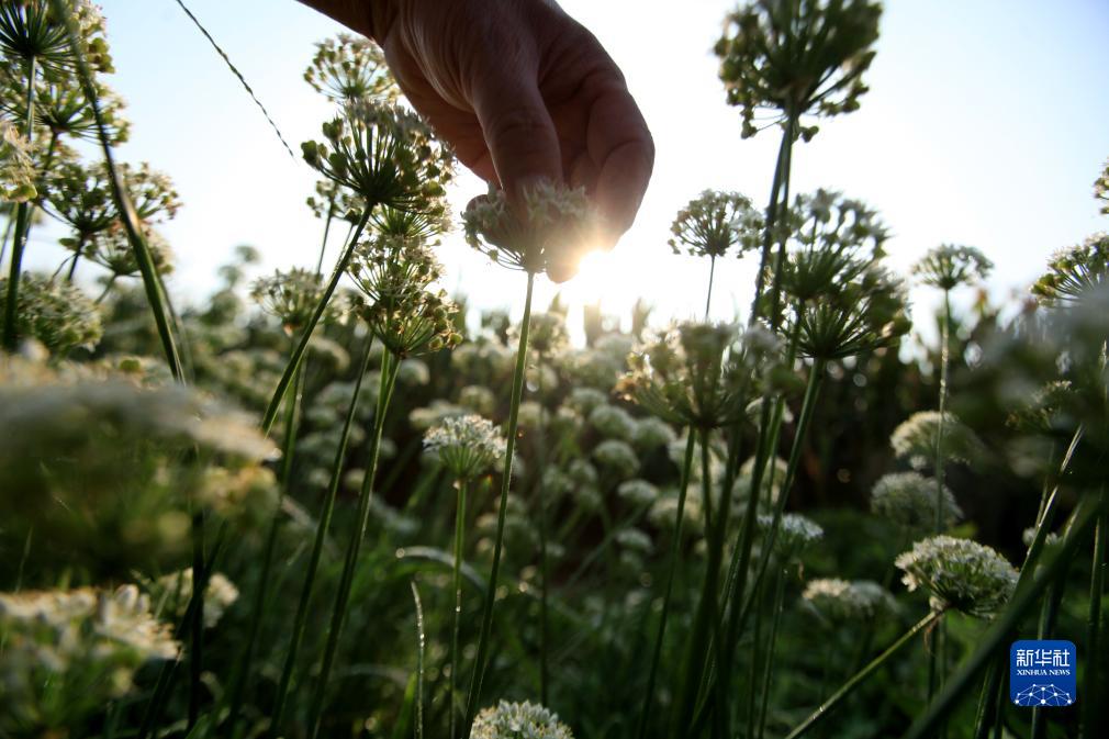 9月6日,在山东省临沂市平邑县地方镇黄城村,村民在采摘韭菜花。