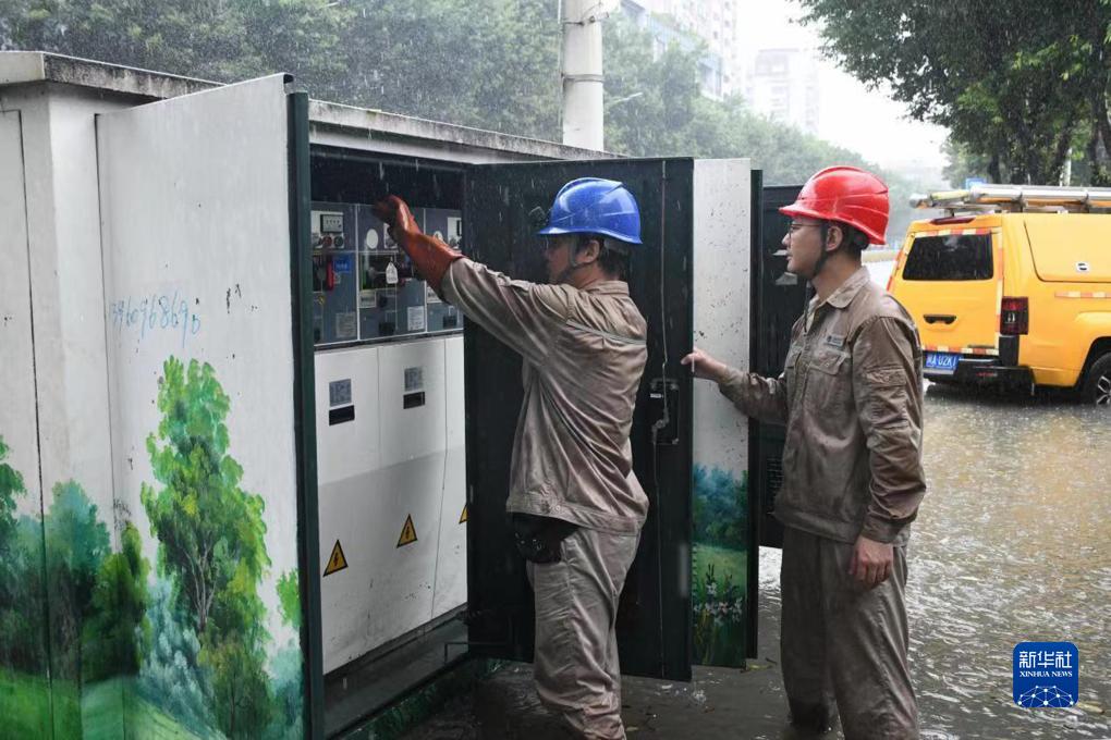 9月6日,福州电力工人站在积水中检修设备。新华社发