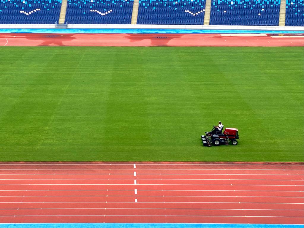 图为工作人员在温州奥体中心体育场维护草坪。新华社记者魏一骏 摄