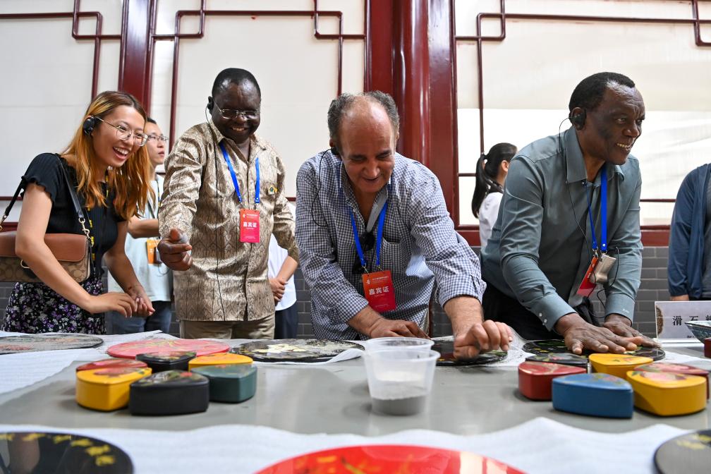 9月7日,使节们在平遥古城体验推光漆器制作。新华社记者 杨晨光 摄