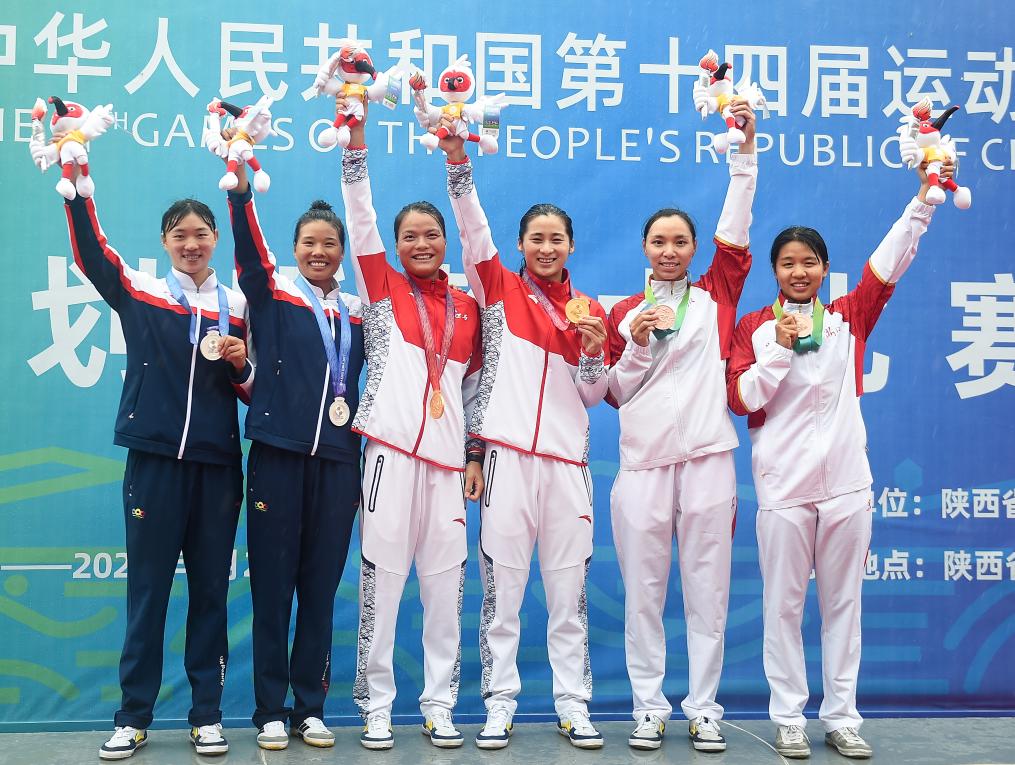 2021年9月25日,李舒琪(右一)与第十四届全运会皮划艇静水女子500米双人划艇决赛其他参赛选手在颁奖仪式上。新华社记者 侯昭康 摄