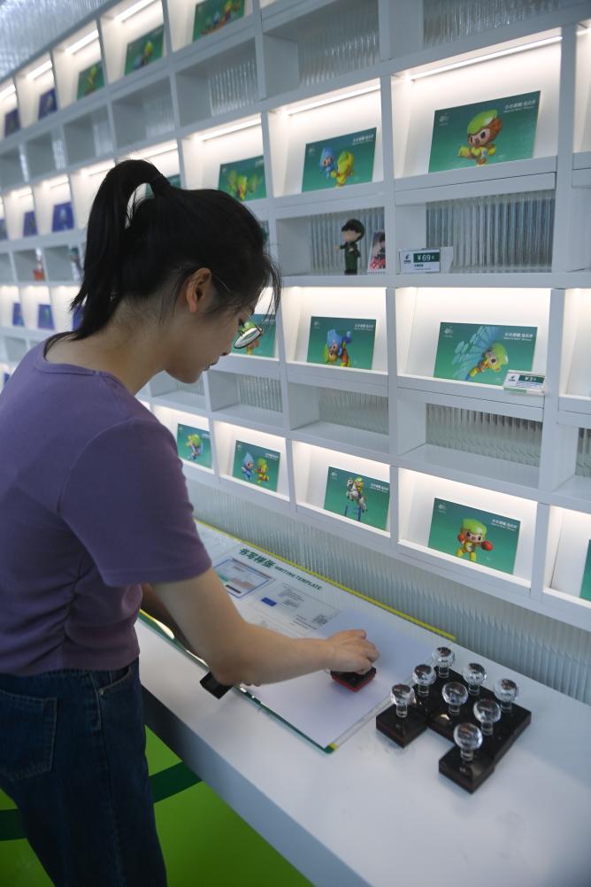 9月1日,一位记者在主媒体中心序厅内的中国邮政展厅盖纪念章。新华社记者 徐昱 摄