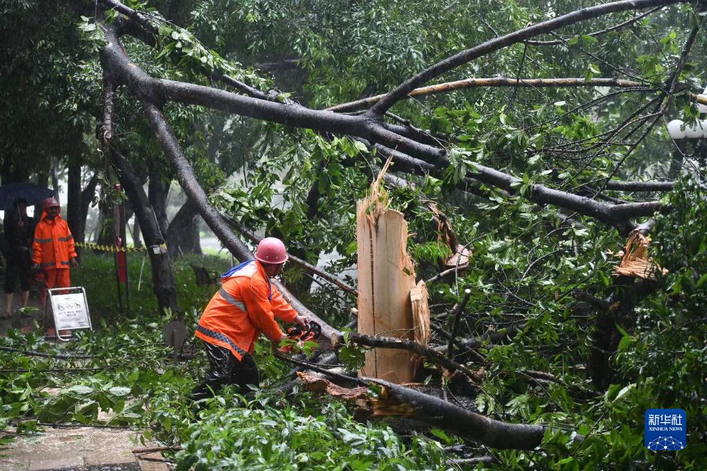 9月8日,深圳园林绿化工人冒雨清理倒伏的树木。