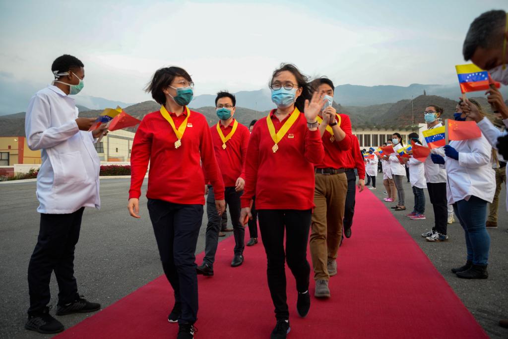2020年4月11日,在委内瑞拉首都加拉加斯,中国抗疫医疗专家组在授勋仪式结束后登机回国。新华社发(萨尔戈多摄)