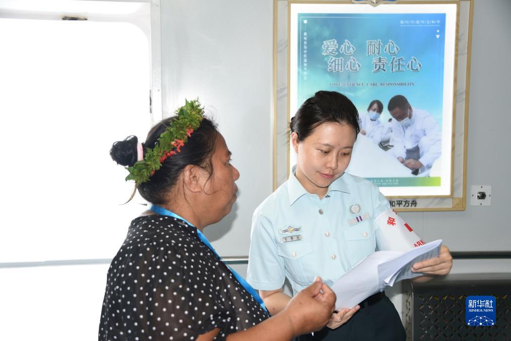 中国海军“和平方舟”号医院船在基里巴斯开展医疗服务期间,一名文职医生为患者解读化验报告(7月15日摄)。新华社记者 黎云 摄