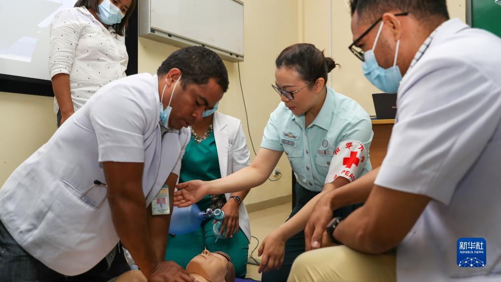 中国海军“和平方舟”号医院船在东帝汶访问期间,派出医疗专家分队赴东帝汶国立医院进行ACLS培训,文职医护人员为国立医院医护人员进行实操讲解(9月5日摄)。新华社发(黎宇 摄)