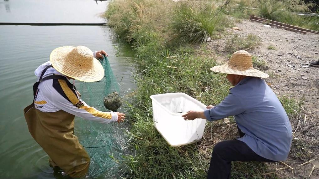8月31日,在新疆阿克苏市润泽农庄养殖基地,养殖户周京森拿着网兜起虾。赵士杰 摄