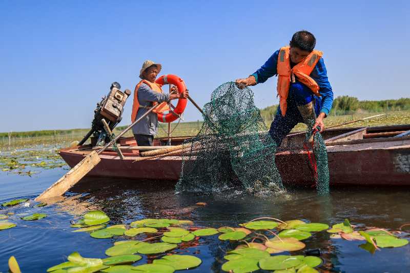 9月1日,在新疆博湖县博斯腾湖,蟹农正忙着捕捞螃蟹。年磊 摄