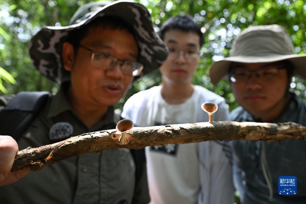 9月5日,曾念开和学生在海南鹦哥岭热带雨林观察一截枯木上的相邻小孔菌。