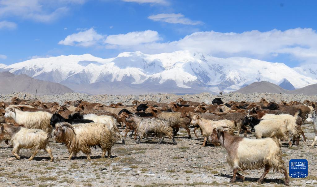 在“冰川之父”慕士塔格峰脚下,新疆塔什库尔干塔吉克自治县塔合曼乡境内的一片天然草场吸引周边乡村的牧羊人在此放牧。进入秋季以来,草场渐渐泛黄,屹立于远处的慕士塔格峰和公格尔九别峰在蓝天白云的映衬下格外壮美,一幅宁静悠远的牧羊图引人入胜。