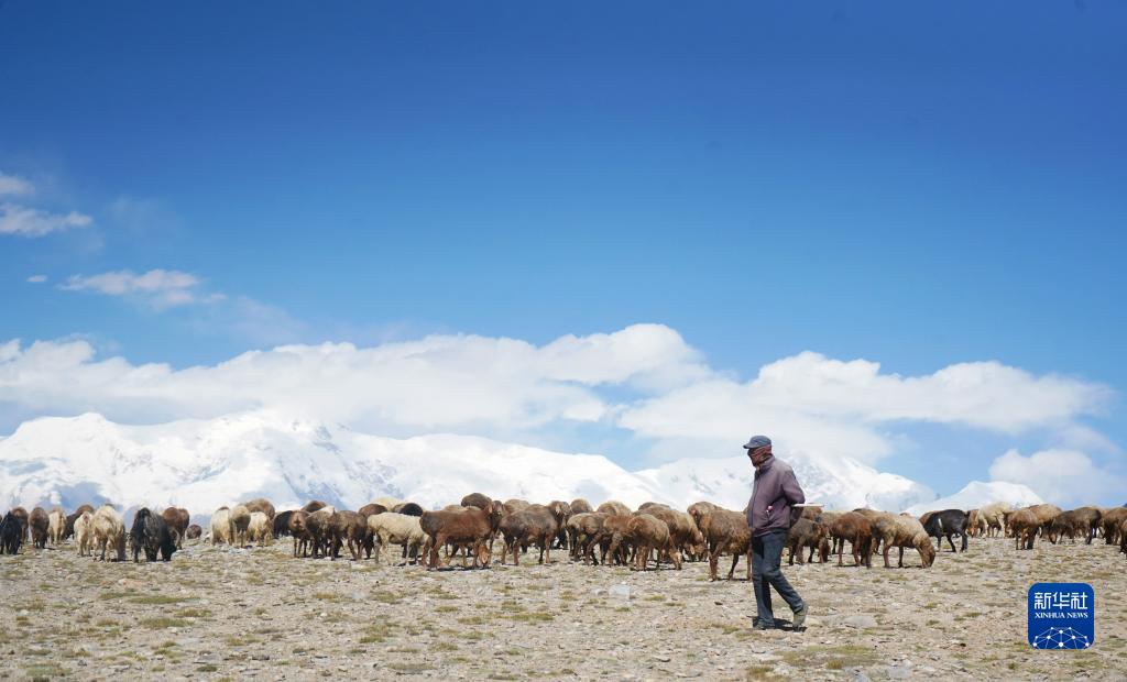 在“冰川之父”慕士塔格峰脚下,新疆塔什库尔干塔吉克自治县塔合曼乡境内的一片天然草场吸引周边乡村的牧羊人在此放牧。进入秋季以来,草场渐渐泛黄,屹立于远处的慕士塔格峰和公格尔九别峰在蓝天白云的映衬下格外壮美,一幅宁静悠远的牧羊图引人入胜。
