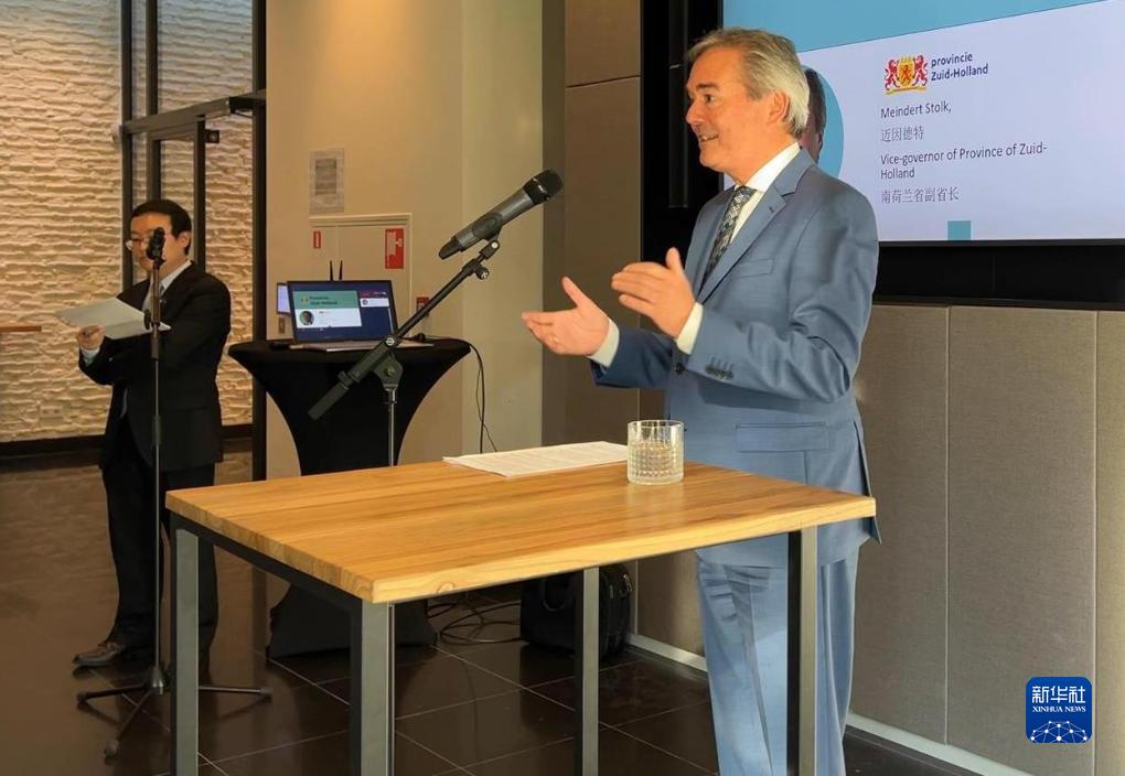 9月8日,在荷兰海牙,荷兰南荷兰省副省长斯托尔克在对接会上致辞。新华社发(西尔维娅·莱德雷尔摄)