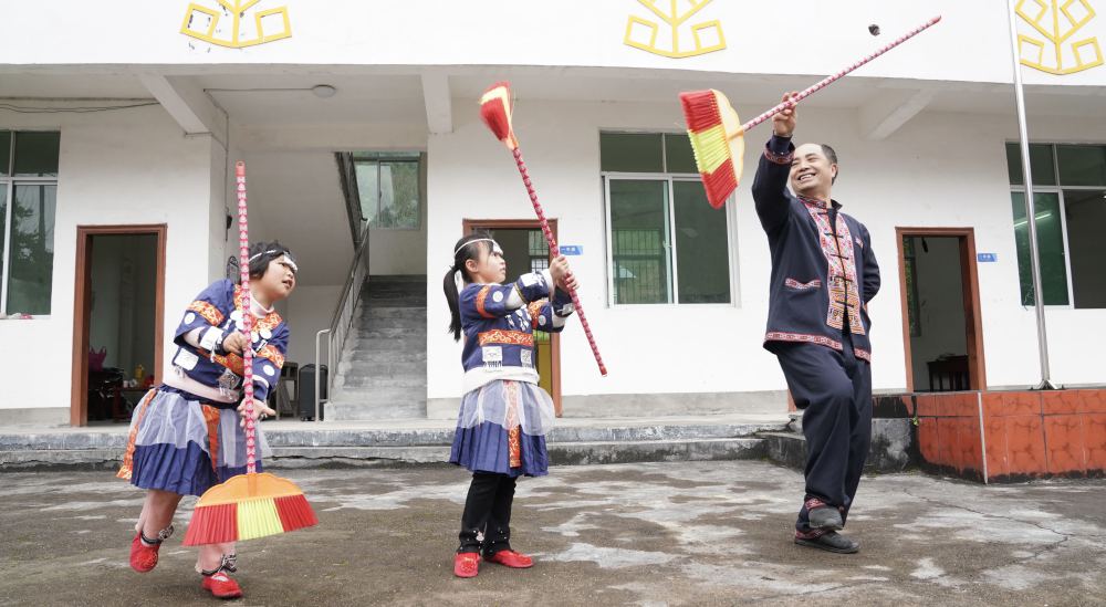 ↑2023年2月8日,邓烟发在校内用扫帚代替花棍,教孩子跳瑶族传统舞蹈——花棍舞。江西省全南县瑶族双语小学所在的陂头镇瑶山村,背靠苍茫大山,53岁的邓烟发是学校目前唯一的老师。三尺讲台,29年光阴,邓烟发见证着无数瑶族孩子从这里迈向远方。 新华社记者 胡晨欢 摄