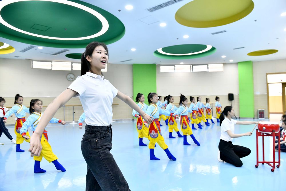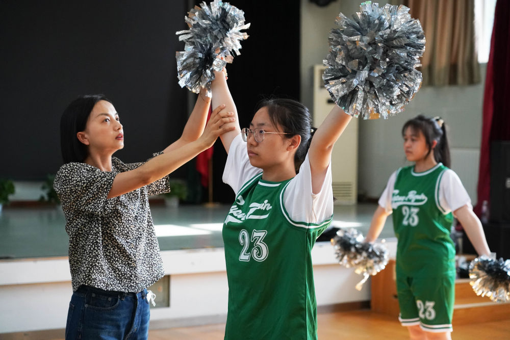 ↑2023年5月23日,在济南市历城二中闻韶艺术馆,臧杰老师带着同学们练习舞蹈。 山东省济南市历城二中聚焦艺术教育课程育人功能,通过开展国乐、舞蹈、合唱等项目,培养学生的兴趣特长和审美情趣,陶冶学生情操,提升学生的艺术修养。新华社记者 郭绪雷摄
