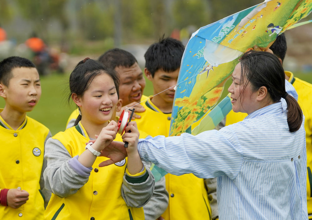 ↑2023年3月31日,重庆广阳岛的一片草地上,重庆市特殊教育中心的老师李英(右一)在指导视力障碍学生如何放风筝。新华社记者 刘潺 摄