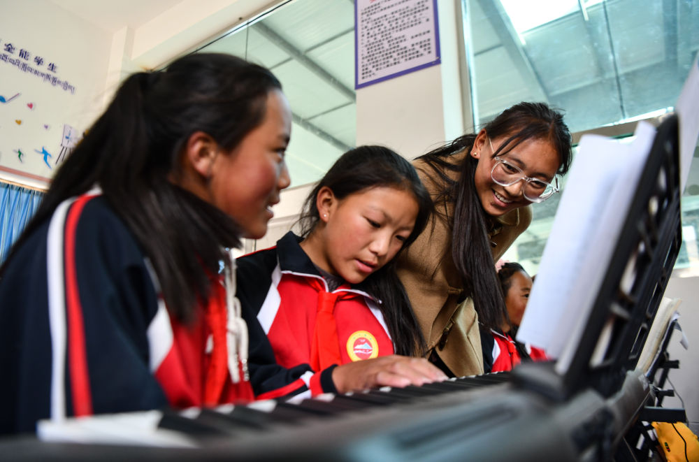 ↑2023年6月5日,在距离珠峰最近的小学——西藏日喀则市定日县扎西宗乡完全小学,钢琴课老师巴桑(右一)在给学生指导指法。新华社记者 晋美多吉 摄