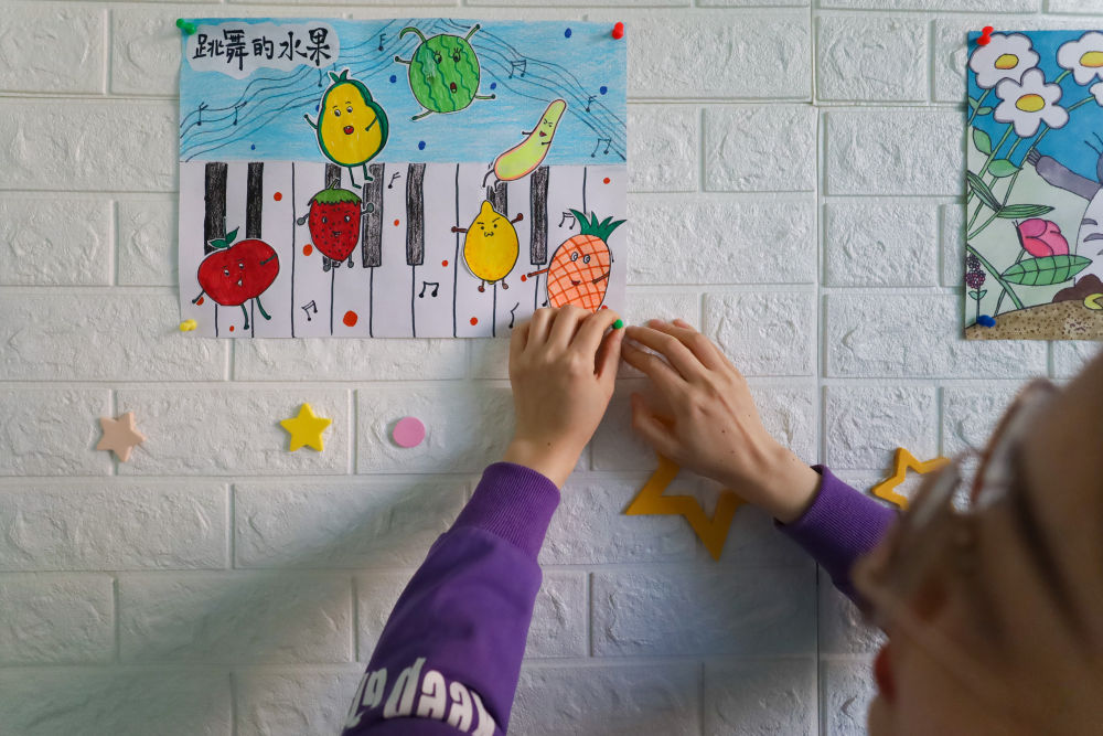 ↑2023年3月31日,在位于甘肃省兰州市的兰州欣雨星儿童心理发展中心,特教老师陈进把孤独症儿童的绘画作品钉在墙上。新华社记者 马希平 摄