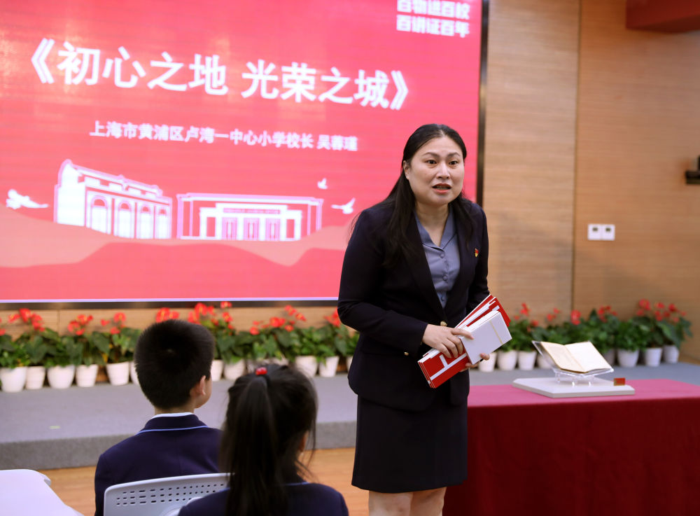 ↑2021年11月11日,上海市黄浦区卢湾一中心小学校长吴蓉瑾在主题班会上讲述上海的红色历史。新华社记者 刘颖 摄