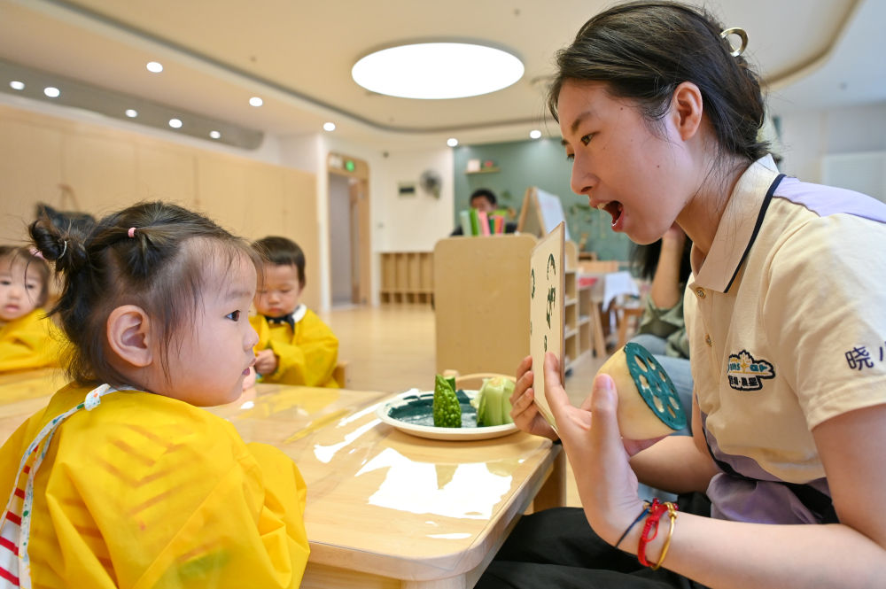 ↑2023年9月4日,托育老师在看护小朋友。南京市建邺区为响应国家发展普惠托育服务的号召,解决年轻职工的带娃难题,积极打造托育从业认证培训体系和教研体系,进一步提升托育服务质量。新华社记者 李博摄