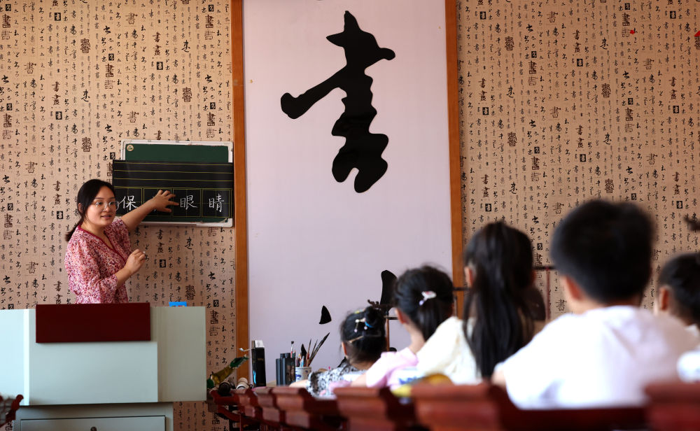 ↑2023年6月29日,在安徽省马鞍山市和县乌江镇卜陈村的“留守未成年人之家”,95岁的叶连平在给孩子们免费上英语课。2000年,他在自己家里开办“留守未成年人之家”,为乡村孩子免费补习英语,至今已有23年。新华社记者 张端 摄