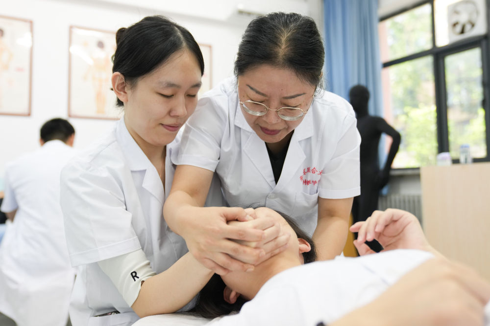 ↑2022年9月8日,在北京联合大学保健按摩实训课上,张琳(右)握着一名视障学生的手带她感受按摩的力度和角度。1995年,张琳从北京中医药大学毕业后,一直从事残障学生的教学工作。2011年她来到北京联合大学特殊教育学院,主要负责教授视障学生推拿治疗和保健按摩。她希望学生通过一技之长,改变自己的生活。新华社记者 鞠焕宗 摄