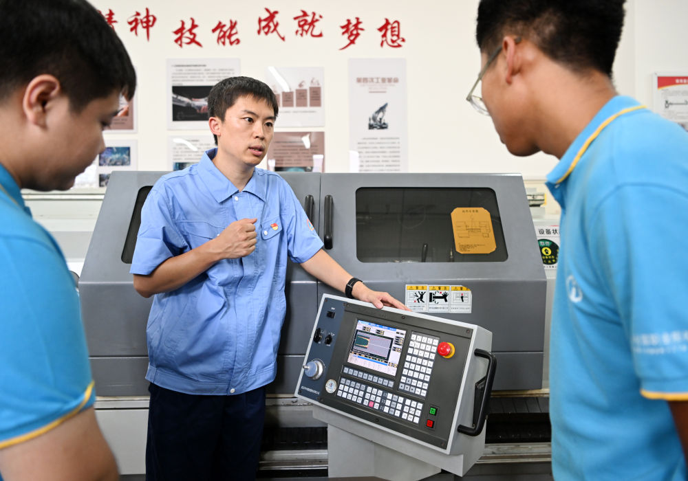 ↑2022年8月8日,许超(中)在天津机电职业技术学院的教室内给学生讲解设备操作要领。2005年高中毕业后,许超来到天津机电职业技术学院数控专业学习,从一名大专学生成长为职业院校老师。他在一点一滴的细节中向学生传授着工匠精神的内涵。新华社记者 李然 摄