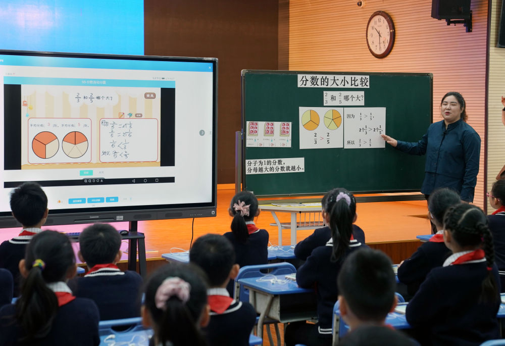 ↑2021年11月18日,在上海市杨浦区平凉路第三小学的“教学助手”展示课上,数学教师张智玮在黑板上进行知识点讲解分析,显示屏上有学生们的人机互动结果和学习效果的统计数据。 新华社记者 刘颖 摄