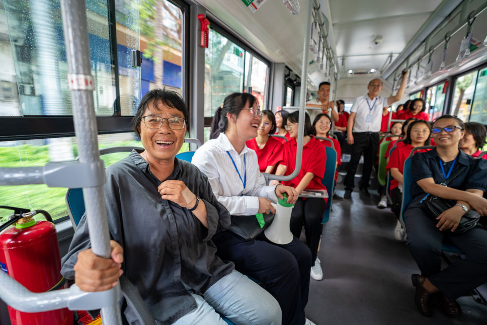 ↑2023年6月7日,高考首日结束,张桂梅与学生在返回的车辆上一起唱歌。自云南丽江华坪女子高中的学生2011年首次参加高考以来,张桂梅校长每年都要送考,这一送就是13年。新华社记者 江文耀 摄