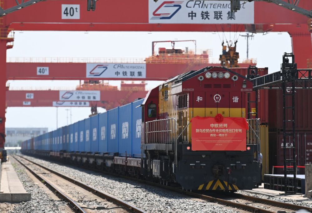 2023年8月3日,中欧班列(西安-塔什干)陕乌经贸合作隆基绿能光伏组件出口专列在西安国际港站准备发车。新华社记者 邹竞一 摄