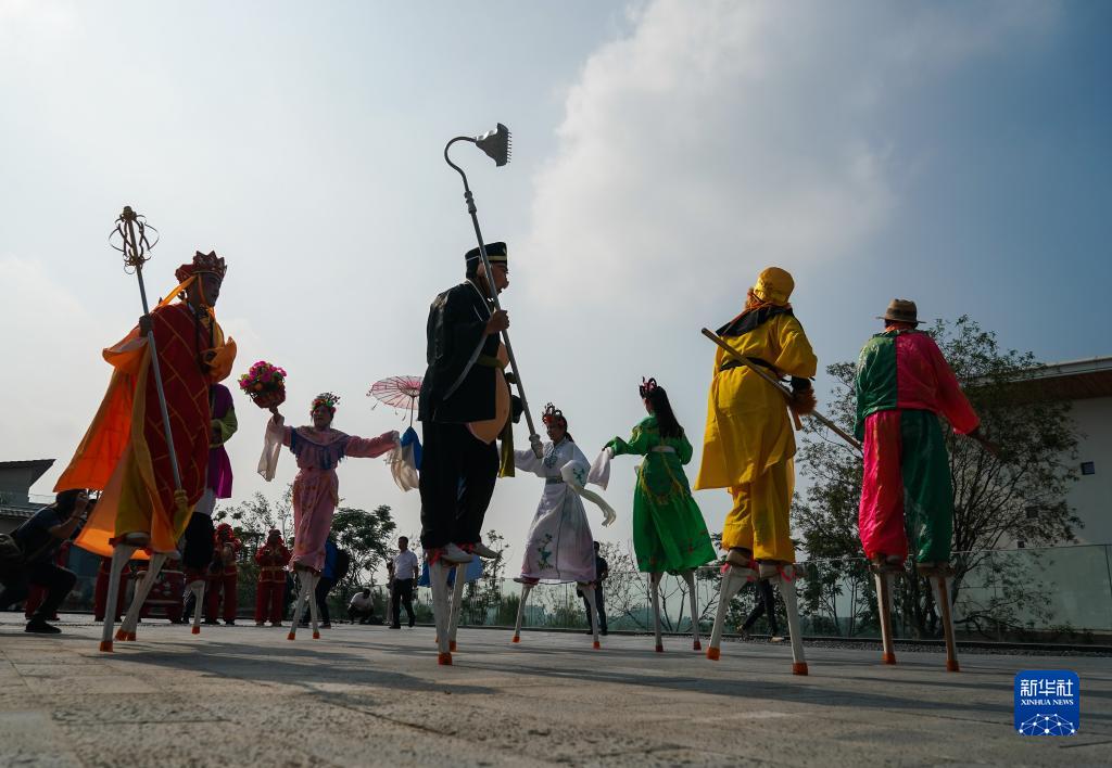 9月9日,在宿迁市宿城区蔡集镇牛角村欢乐田园度假区,群众在表演宿迁市非物质文化遗产“董王高跷”。
