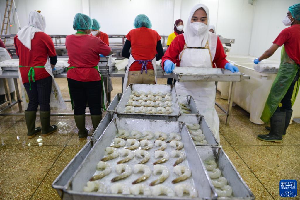 8月29日,在印度尼西亚中爪哇省三宝垄市,工人在福建淼天汇食品有限公司印尼公司的对虾加工生产线上工作。新华社记者 徐钦 摄