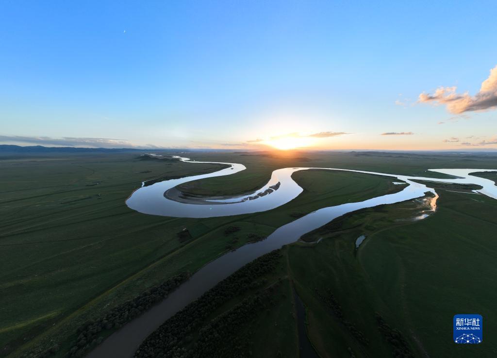 这是8月21日在四川省阿坝藏族羌族自治州若尔盖县唐克镇拍摄的黄河九曲第一湾落日(无人机照片)。