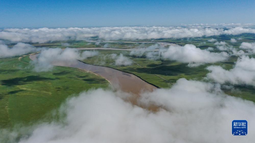 这是8月22日清晨在四川省阿坝藏族羌族自治州若尔盖县唐克镇拍摄的黄河九曲第一湾景色(无人机照片)。