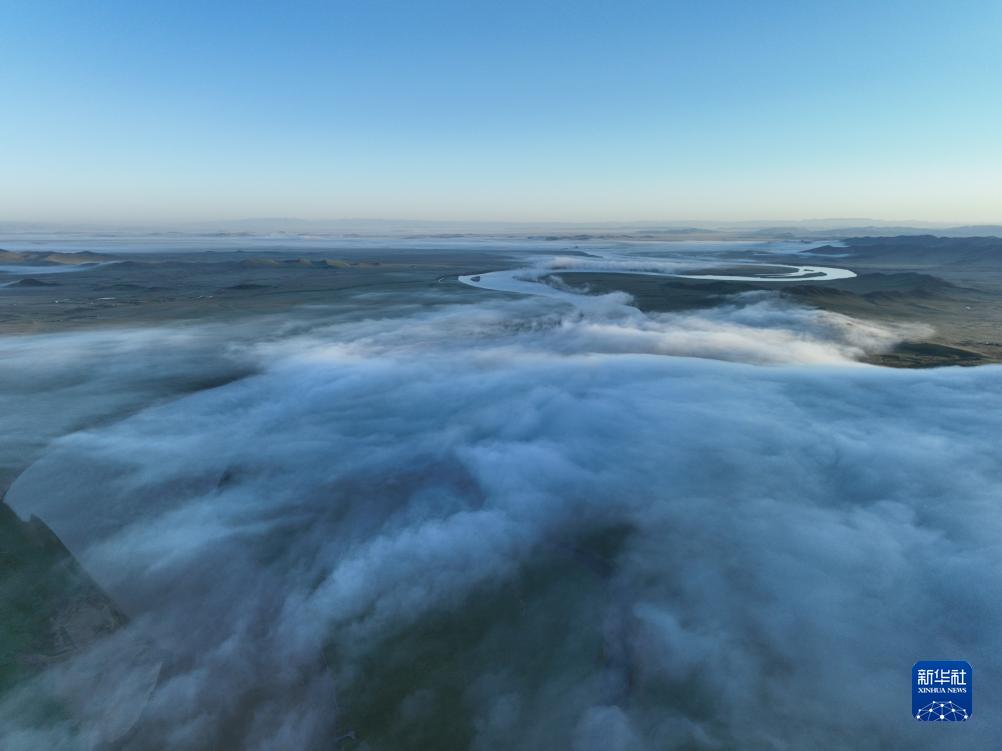 这是8月22日清晨在四川省阿坝藏族羌族自治州若尔盖县唐克镇拍摄的黄河九曲第一湾景色(无人机照片)。