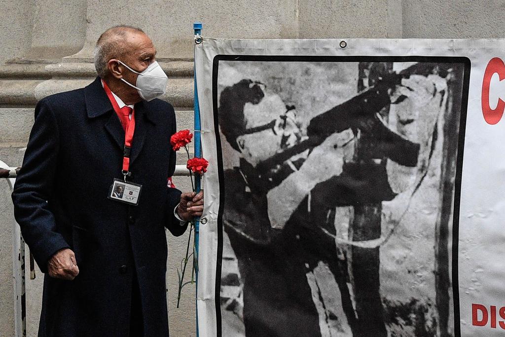 2022年9月11日,智利首都圣地亚哥,一名男子手执红色康乃馨纪念前总统阿连德遇难49周年。(新华社发,豪尔赫·比列加斯摄)