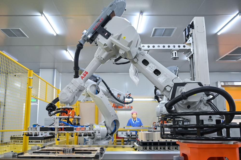 智能机器人在纬景储能盐城智造基地生产车间进行锌铁液流电池电堆总装堆叠作业(9月8日摄)。新华社记者李博 摄