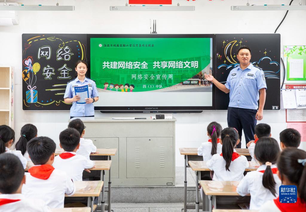 9月11日,在江苏省海安经济开发区实验小学,海安市公安局城东派出所民警在给小学生普及网络安全知识。