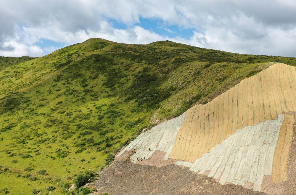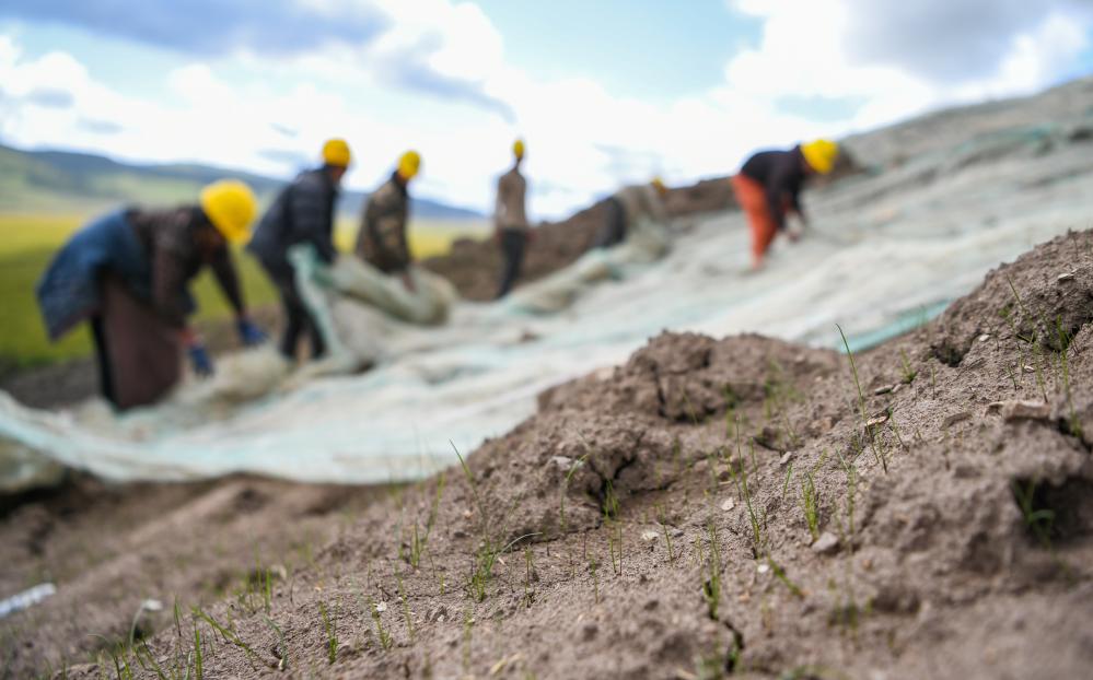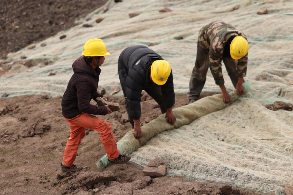在四川省阿坝藏族羌族自治州若尔盖县达扎寺镇多玛村废弃矿山治理点,工人们正在边坡上铺椰丝毯。新华社记者 邢广利 摄