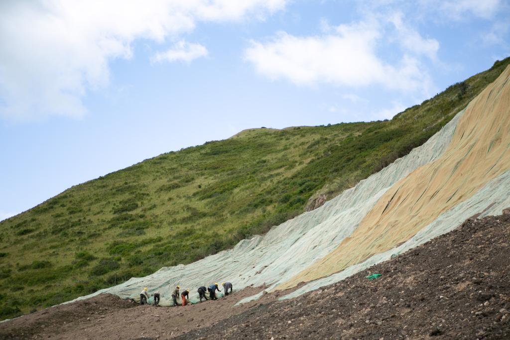 在四川省阿坝藏族羌族自治州若尔盖县达扎寺镇多玛村废弃矿山治理点,工人们正在边坡上铺椰丝毯。新华社记者 王曦 摄