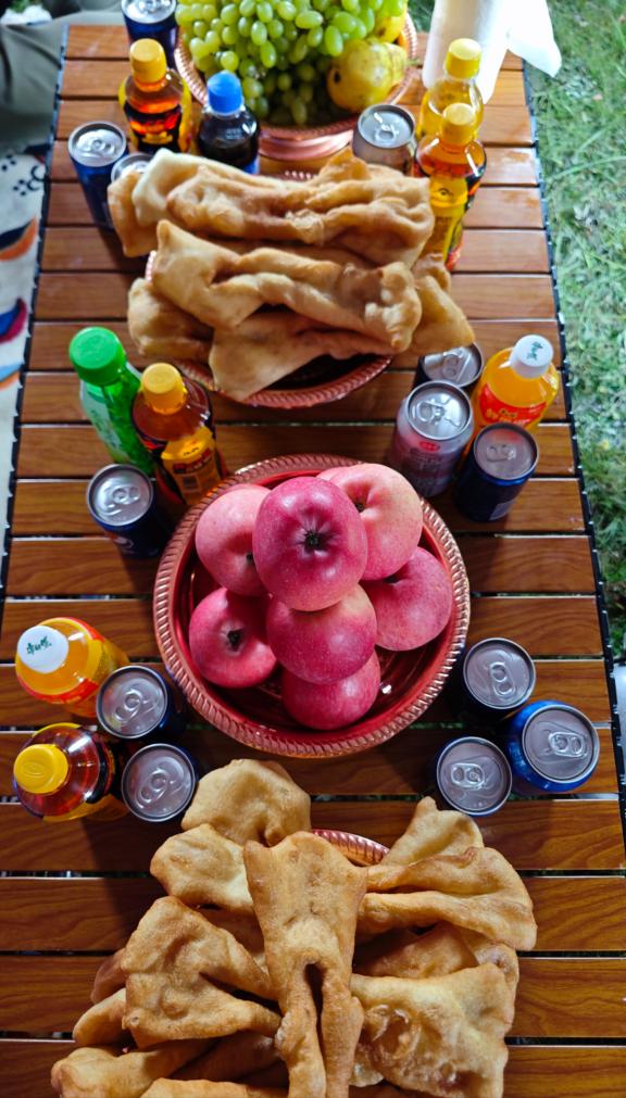 我们到他们家的时候,扎西曲培的妻子斗格吉怕我们不习惯糌粑,又用羊肉汤给我们煮了一锅面条,香气弥漫在整个帐篷里。桌子上摆满了水果、饮料,用来招待我们。大家盘腿围坐在烧着牛粪的火炉旁,听扎西曲培讲他的故事。