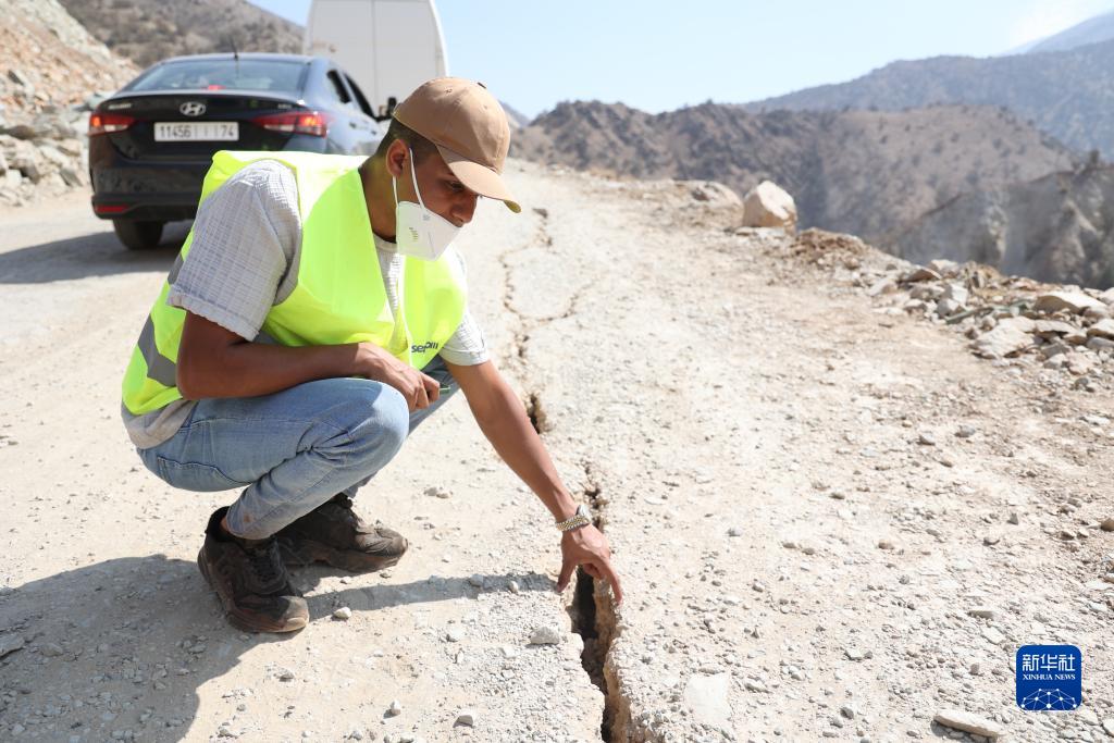 9月12日,在从摩洛哥马拉喀什出发赶赴震中区域塔拉特恩雅库布的路上,一名摩洛哥人向记者展示公路裂缝的宽度。新华社记者 霍晶 摄