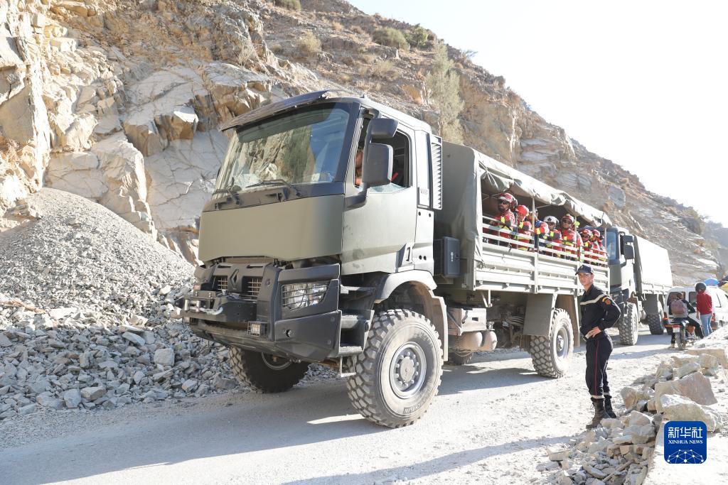这是9月12日在从摩洛哥马拉喀什出发赶赴震中区域塔拉特恩雅库布的路上拍摄的一辆载运救援人员的摩洛哥军车。新华社记者 霍晶 摄