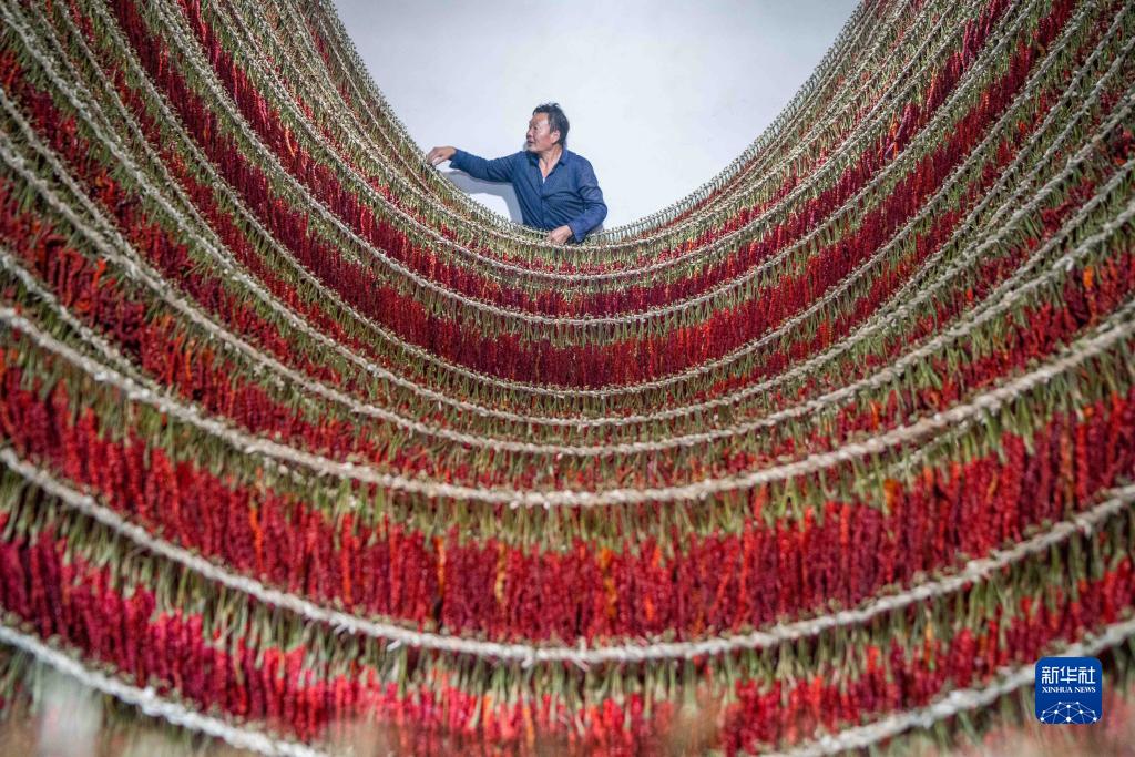 9月13日,村民在贵州省毕节市大方县理化乡金鸡村查看辣椒烘干情况。