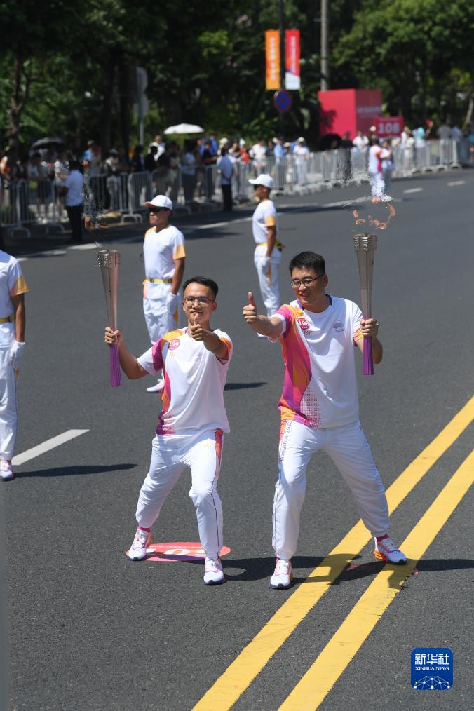 9月15日,火炬手陈永概(右)和何亦鑫在火炬传递中。